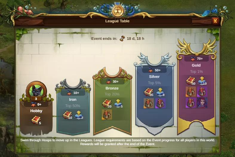 Puedes llegar a cinco ligas diferentes compitiendo en el evento: Hobby, Hierro, Bronze, Plata, y Oro, Cada Liga está limitada a un número jugadores con una cantidad de puntos requerida para esa Liga. Si una Liga ya está llena, pasarás a la siguiente Liga pero recuerda, las posiciones en las Ligas se recalculan cada hora, así que no pierdas la esperanza y sigue compitiendo en la carrera para poder progresar. ¡ Y hazlo en las Ligas también!